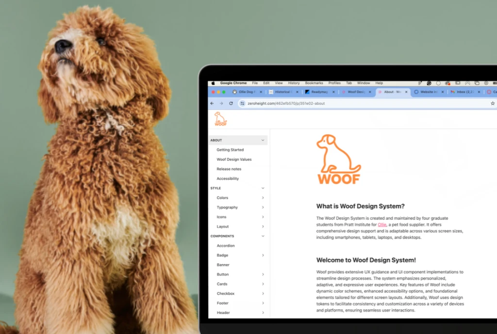 "Woof" is the unofficial design system for Ollie, a popular dog food brand. I used advanced Figma techniques and documentation to build a design system from 0 to 100.