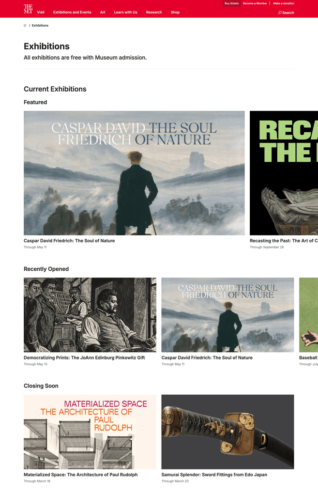As a fellow at The Met, I worked on the exhibitions page revamp to improve visitor expectations of what to see via new page interactions and content restructuring.