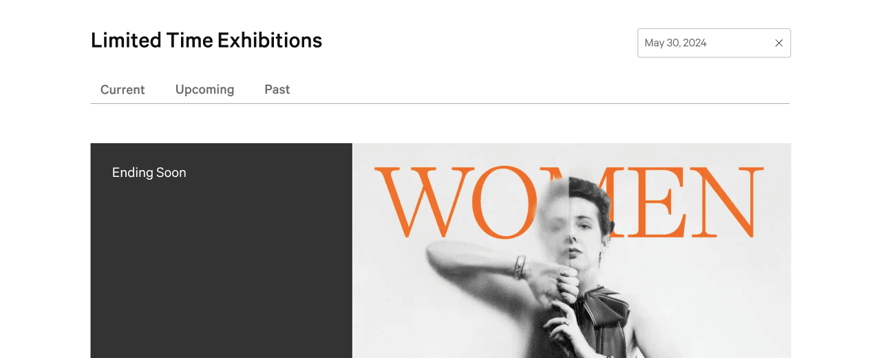 Carousels also helped collapse tabs on the page, expanding and adapting our time-based naming system to structure the page: always at the met = ongoing, limited time = temporary, top priority exhibition cards = recently opened or closing soon.
