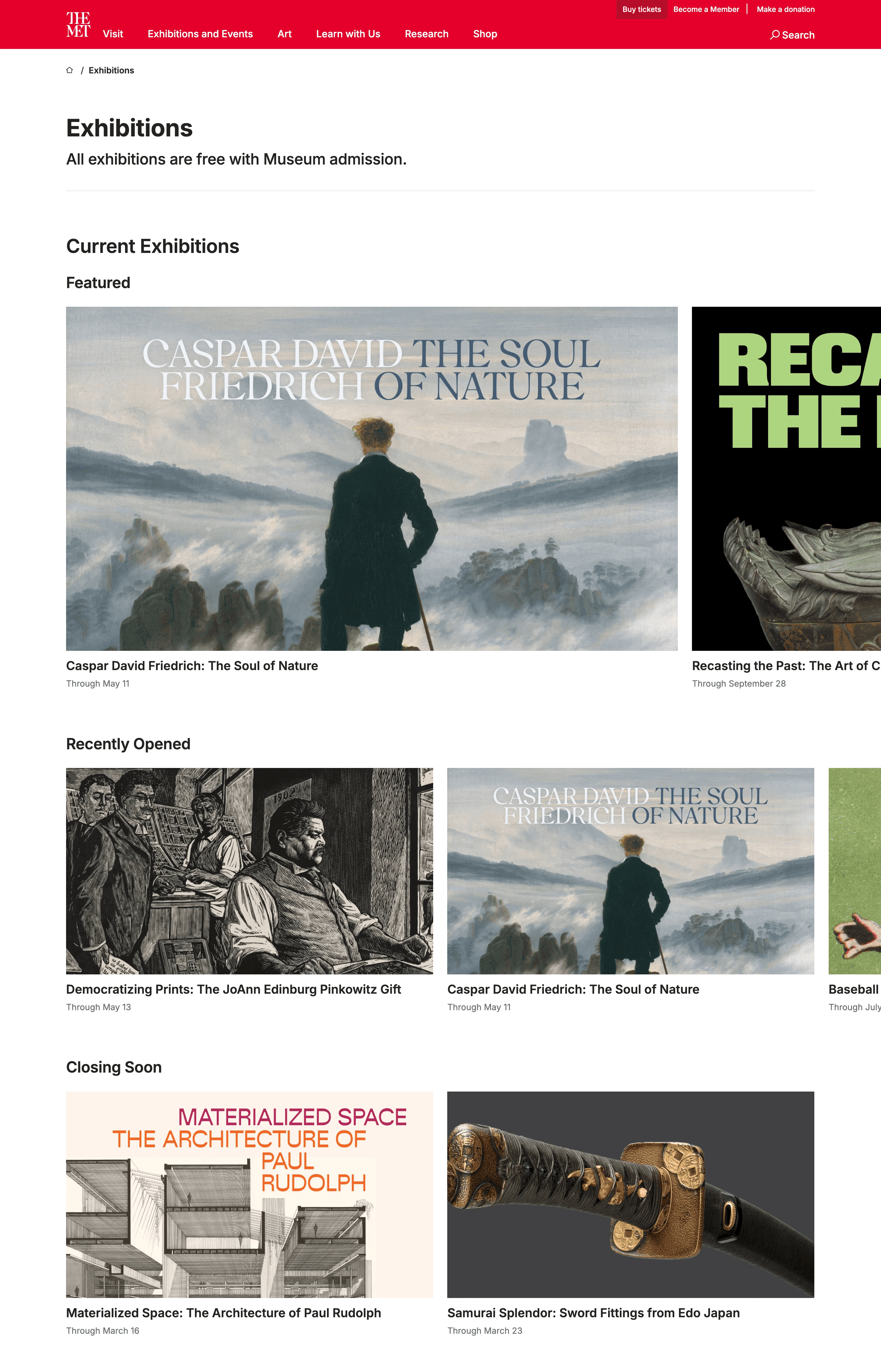 Building on 150+ years of engaging audiences, I worked on revamping the exhibitions page to help improve visitor expectations of what to see in the galleries. I joined The Met's product team as a fellow.
