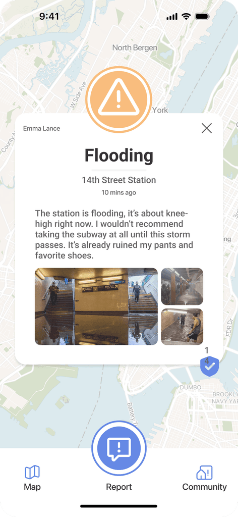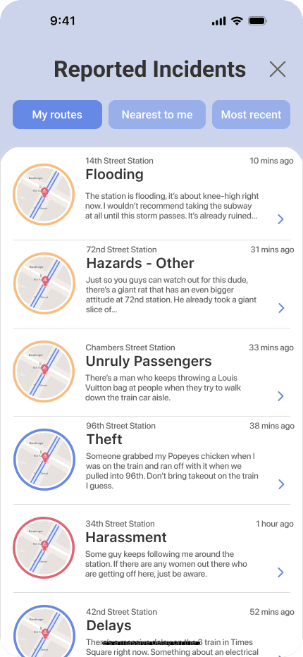 Community was one of the elements we wanted to focus on. We created a feed to show incidents that are most relevant to the user with optional filters. Users could validate incidents they also witnessed in the forum and explore the profiles of those who reported them.