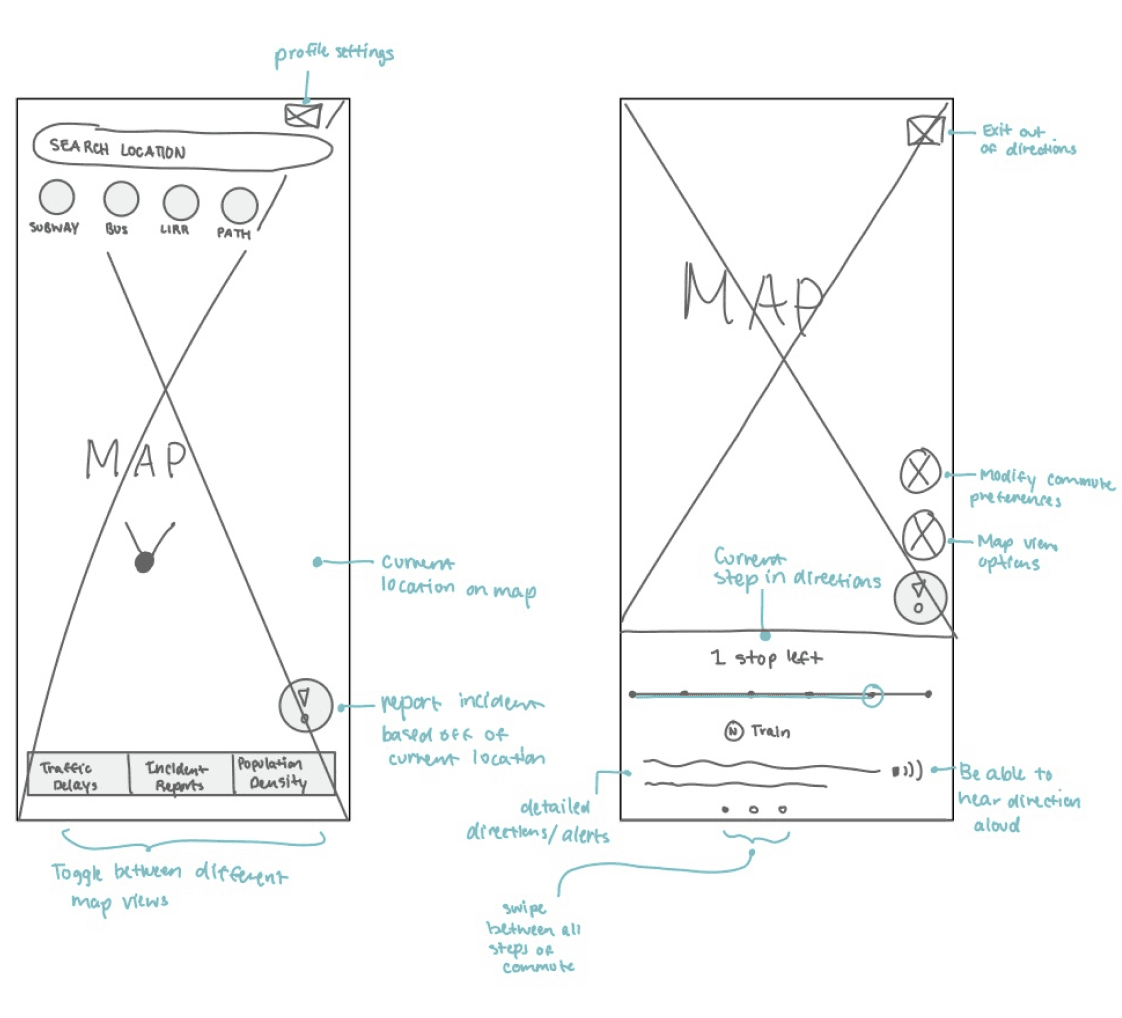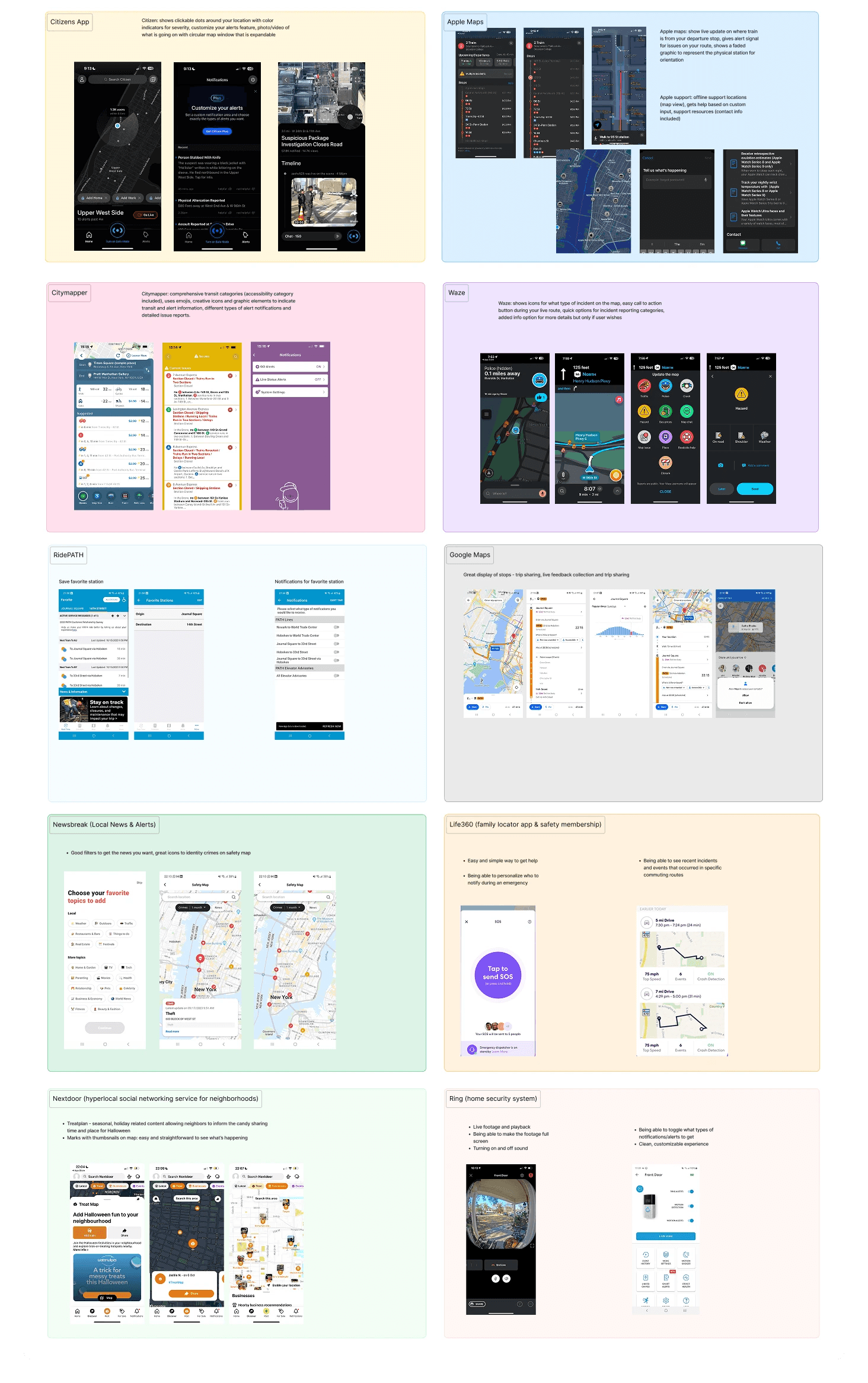 Our research into direct and indirect competitors included apps like Citizen, Apple Maps, Citymapper, Waze, RidePATH, Google Maps, Newsbreak, Life360, Nextdoor, and Ring helped inform our earliest product sketches.