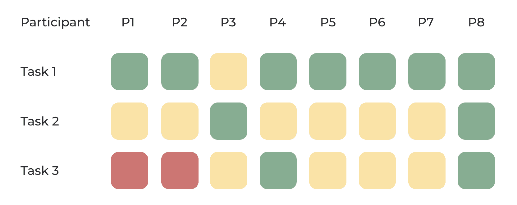 Legend: green = success, yellow = some trouble, red = could not complete task